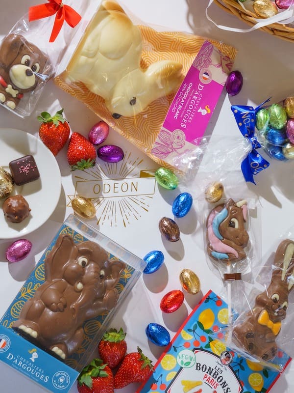 Vous trouverez également chez ODEON une gamme de chocolats de Pâques, avec une sélection de chocolats artisanaux à offrir ou à cacher : lapins, coffrets et œufs issus des maisons Cluizel, Mazet, Alléno & Rivoire ou Chevalier d’Argouges.