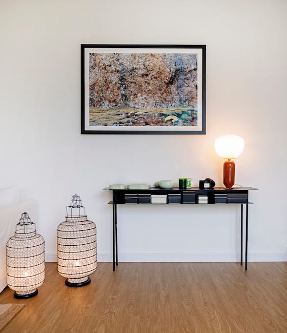 La console tient une position centrale dans le salon, diffusant des arômes de figues, menthe fraiche et basilic (bougies Dyptique, pot pourri Mad et Len).