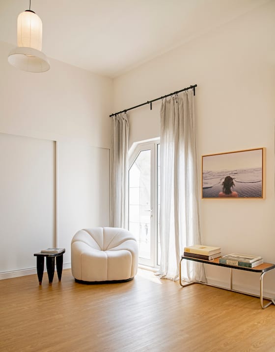 Nous y avons installé un fauteuil d’inspiration Togo, agrémenté d’une œuvre de Victor Cadene (qui était auparavant représenté à Comptoir 102) et d’un pot vintage couleur celadon et un banc en orme (disponibles chez Maison Aimée).