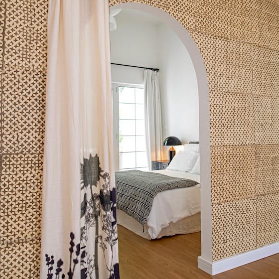 Nous avons créé un mur avec un délimitation franche à l’aide d’un papier peint Le Monde Sauvage et des rideaux Caravane.