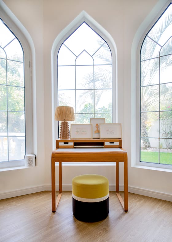 Nous avons refait le sol avec une couleur de parquet naturel trouvée à Dragon Mart pour harmoniser l’espace et rendre hommage aux volumes du salon. Les canapés sont blancs, pour pouvoir jouer avec des coussins en fonction des envies du moment. Actuellement, nous avons quelques coussins de la marque Caravane. Les fauteuils proviennent de chez Madame Stolz (modèle Wicker).