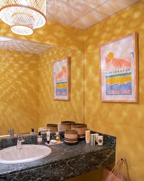 Une box colorée illumine cette pièce sans fenêtre grâce à la peinture jaune platane d’Argile (disponible chez Maison Aimée) et la sérigraphie de Julie Daumen, des vases de Socialite Family et quelques accessoires qui sentent bon les vacances.